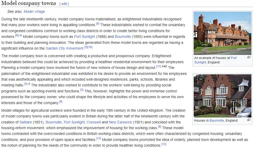 In the section on Echota in the screen shot above, you’ll notice the term “model workers’ town”. Before movies like the Hunger Games showed us what that would like in reality (District 12), this madness used to be called the “company store”. Remember that King Gillette’s book came out in 1894—that’s how long these people have been planning your 15-minute slave cities. Before we get to the company store issue, let’s look at “model worker’s town”.