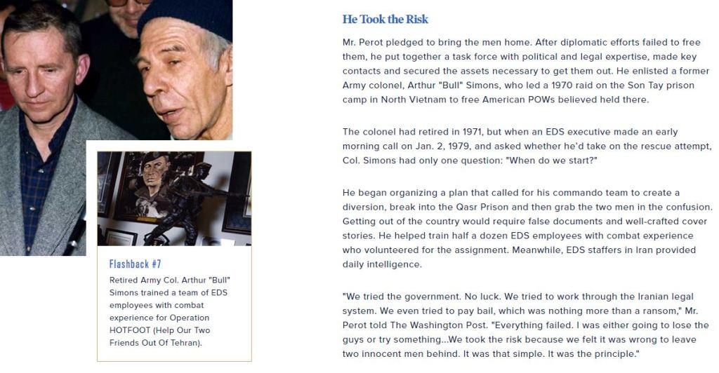 Ross Perot was more than just a self-made billionaire and patriot, he was also what some referred to as the “Patron Saint of POWs”, and also personally paid for and organized the rescue mission of 2 EDS employees being held hostage in Iran. He did this as a private citizen, long before running for President: