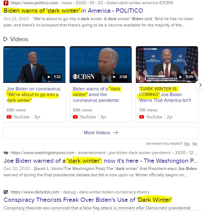 The public may remember that three years ago (2020), the current resident in the White House, for a brief but very noticeable period began repeating the phrase “dark winter” as though it was some kind of code word meant to initiate something. As the last example in the below screen shot implies, the alternative media immediately attempted to dissect the term, feeling it portended something sinister on the horizon. In that aspect alone they weren’t wrong, although many thought it had to do with power grids shutting down. A sensible commentary, given the, “our power grids are vulnerable to hackers” language also being repeated for the last several years.