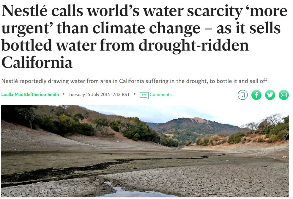Readers may remember Nestle—a multi-national (Capitalist Communist) company more well-known for it’s candy bar with the same name—has for years been sucking aquifers dry during droughts, to sell the water back to the public in the form of a bottled water product. The CEO of Nestle was also on record (see video below) saying he didn’t personally believe that access to water was a basic human right, and should instead be commoditized for corporate profit and longevity. Devoted reality-miners will, no doubt, seriously question why the 27th largest corporation in the world would rather consume and destroy local water sources in America, instead of using desalinization technology to get it directly from the ocean instead. That looks a lot more like ‘blocking the exits’ than it does good business acumen or “sustainable” environmental stewardship: