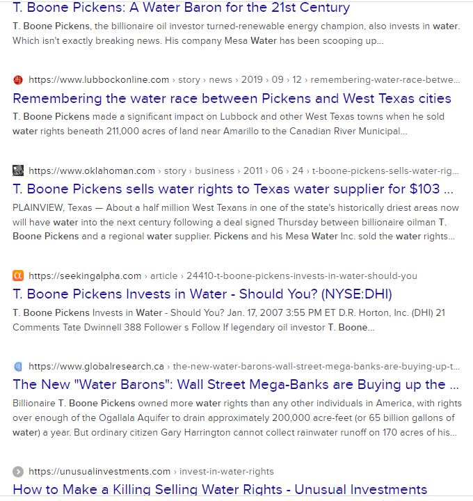 As early as 2007, publicly, globalists were already attempting to make water—through contamination and scarcity—the new oil. In covering the topic, the book featured an interesting billionaire by the name of T. Boone Pickens, who was buying up aquifers at the time, hoping to become a future Water Baron. Below is a screen shot of articles covering his efforts, and my advice to readers then, on the issue of “water scarcity”, is the same I would give readers today: the idea is absurd. Extremely absurd. It’s impossible to run out of water, on a planet literally full of it. Just like cold fusion exists, so too does desalinization technology—sea water can be treated and piped anywhere in the world to grow crops—exceedingly abundant crops, without a single dam or water war ever taking place. Energy isn’t the only resource that Capitalist Communists want to meter and control the population with—they view water the same way. They know you don’t control the world with plenty, you control the world with lack; lack, and fear of lack.